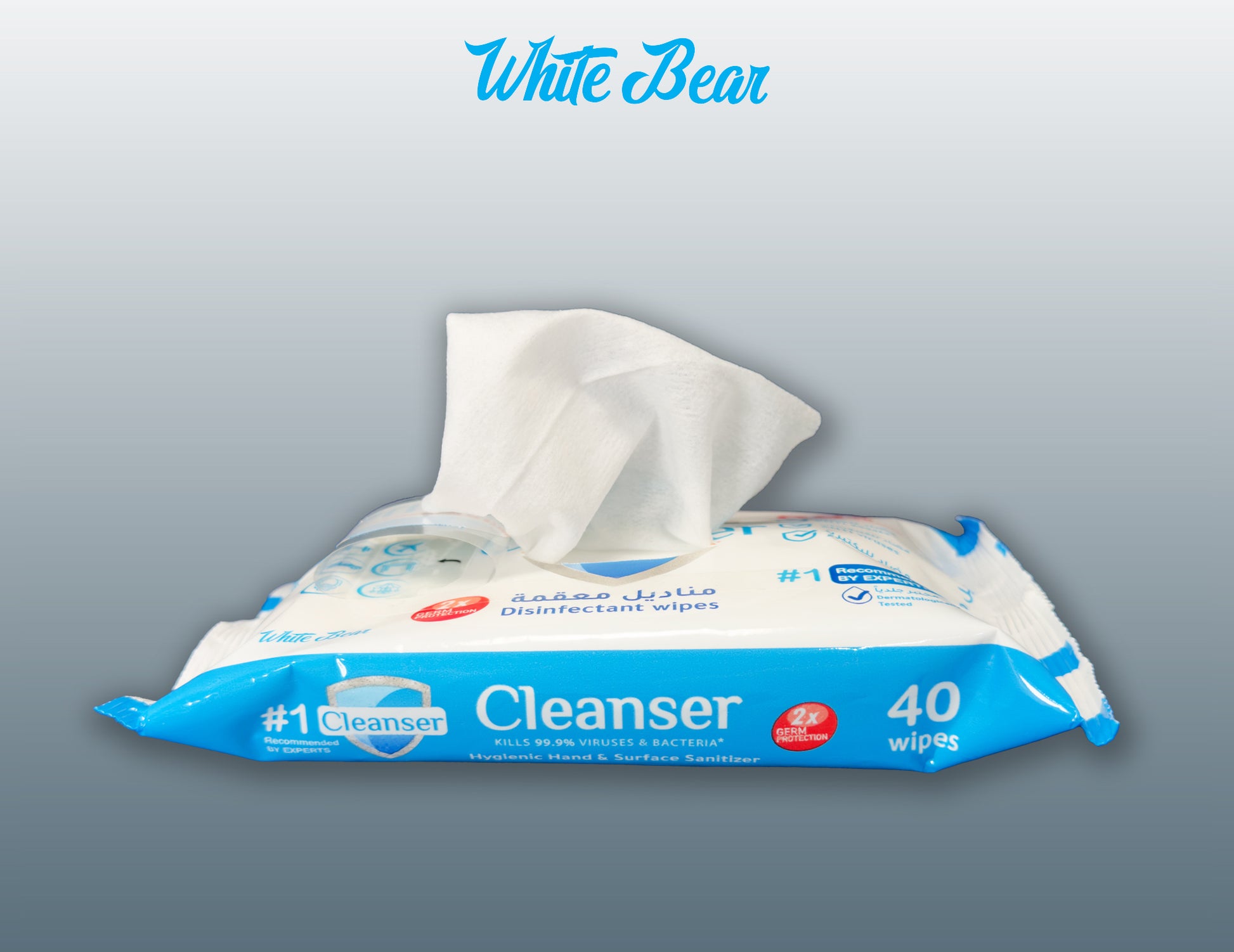 Cleanser Disinfectant Wipes for Hands & Surfaces, effective in eliminating 99.9% of viruses and bacteria. Gentle and safe for daily use. Alcohol-free, providing quick and reliable protection at home, in the office, during travel, and on special occasions. A practical pack of 40 wipes, easy to carry and use anytime.